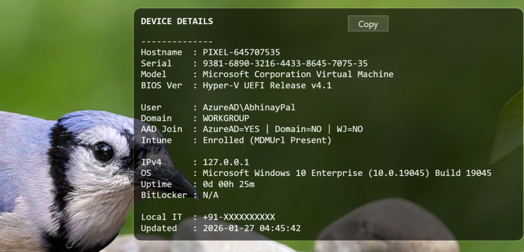 The overlay includes a Copy button that allows users to copy all device details to the clipboard with a single click, making it easy to share information with IT support.